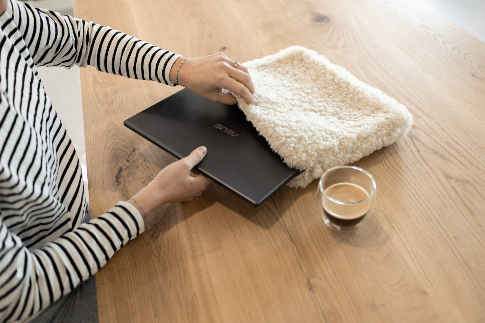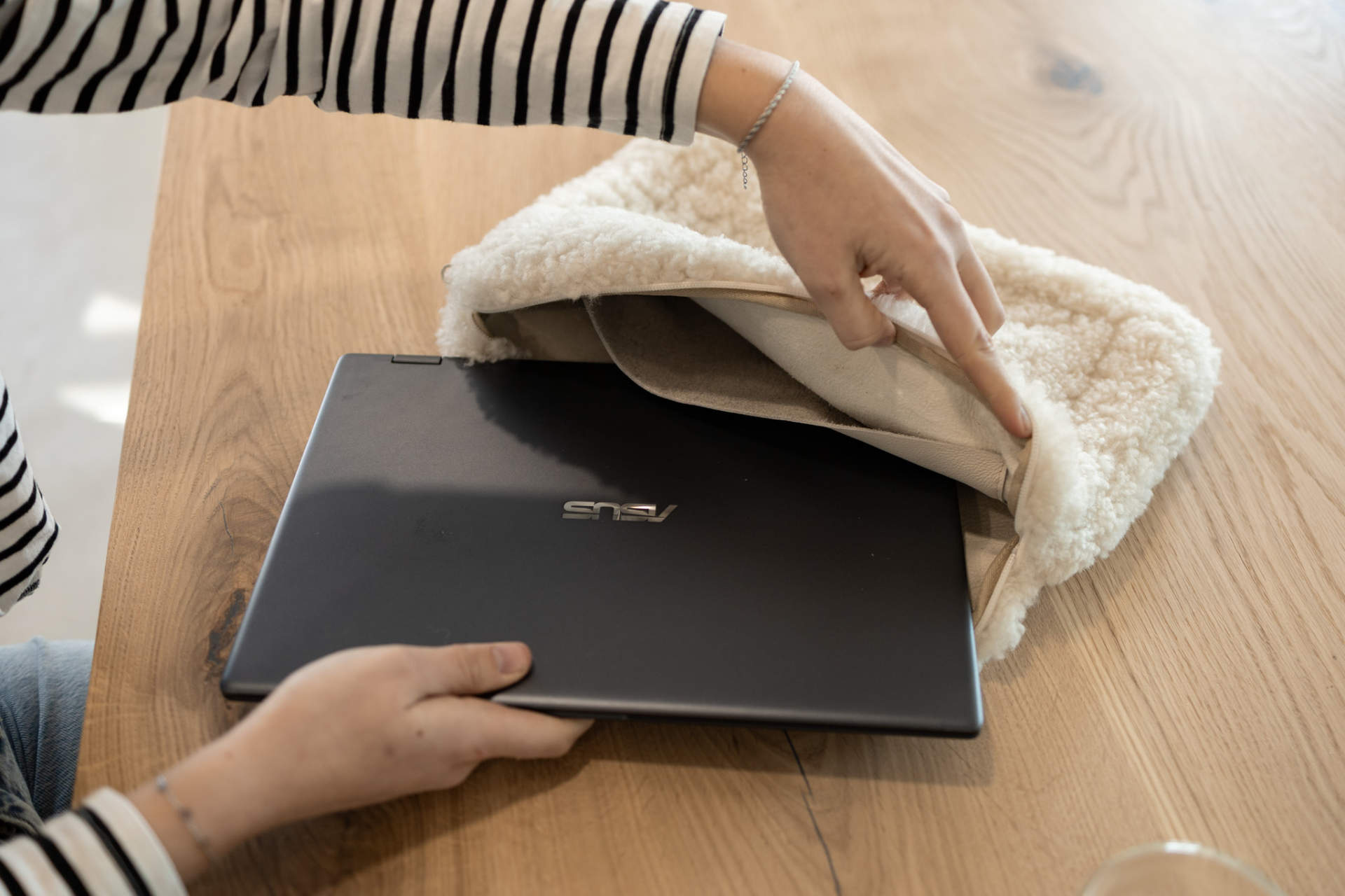 De hoes past bij momenten waarop je je laptop meeneemt naar werk, studie of een afspraak, maar net zo goed bij rustig gebruik thuis. In plaats van een standaard hoes kies je hier voor iets dat zachtheid, comfort en uitstraling samenbrengt. Juist dat maakt hem bijzonder: hij beschermt je laptop, maar voegt tegelijk iets toe aan hoe je je spullen meeneemt en gebruikt.
