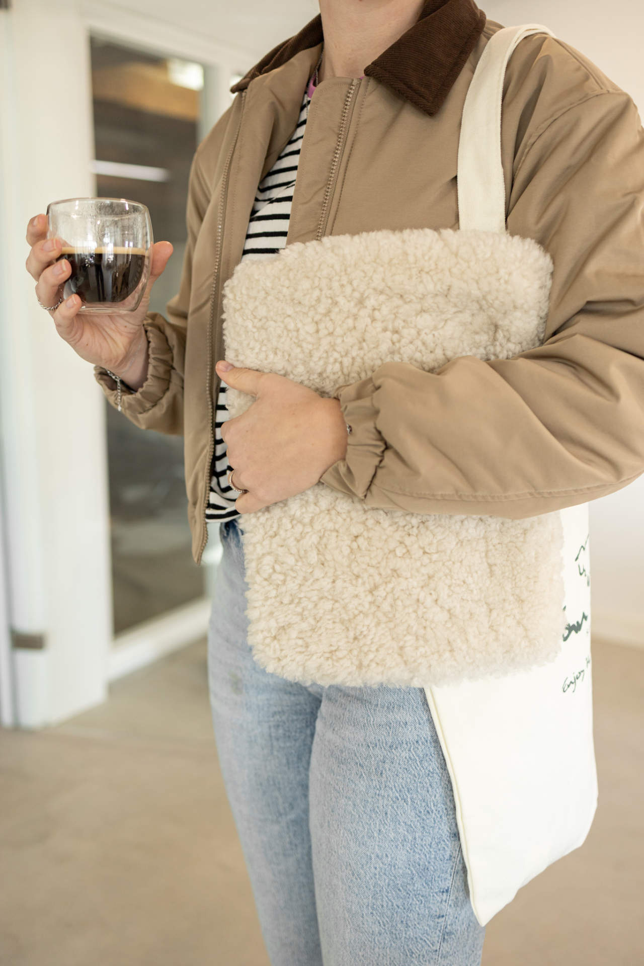 Daarmee krijgt de laptophoes een andere uitstraling dan een standaard uitvoering. Niet afstandelijk of puur praktisch, maar juist vriendelijk, warm en verfijnd. Dat past goed bij wie bewust kiest voor materialen met meer gevoel en uitstraling. De combinatie van de zachte schapenvacht, de rustige Off-White kleur en het praktische binnenvak maakt deze hoes tot een fijne keuze voor iedere dag.