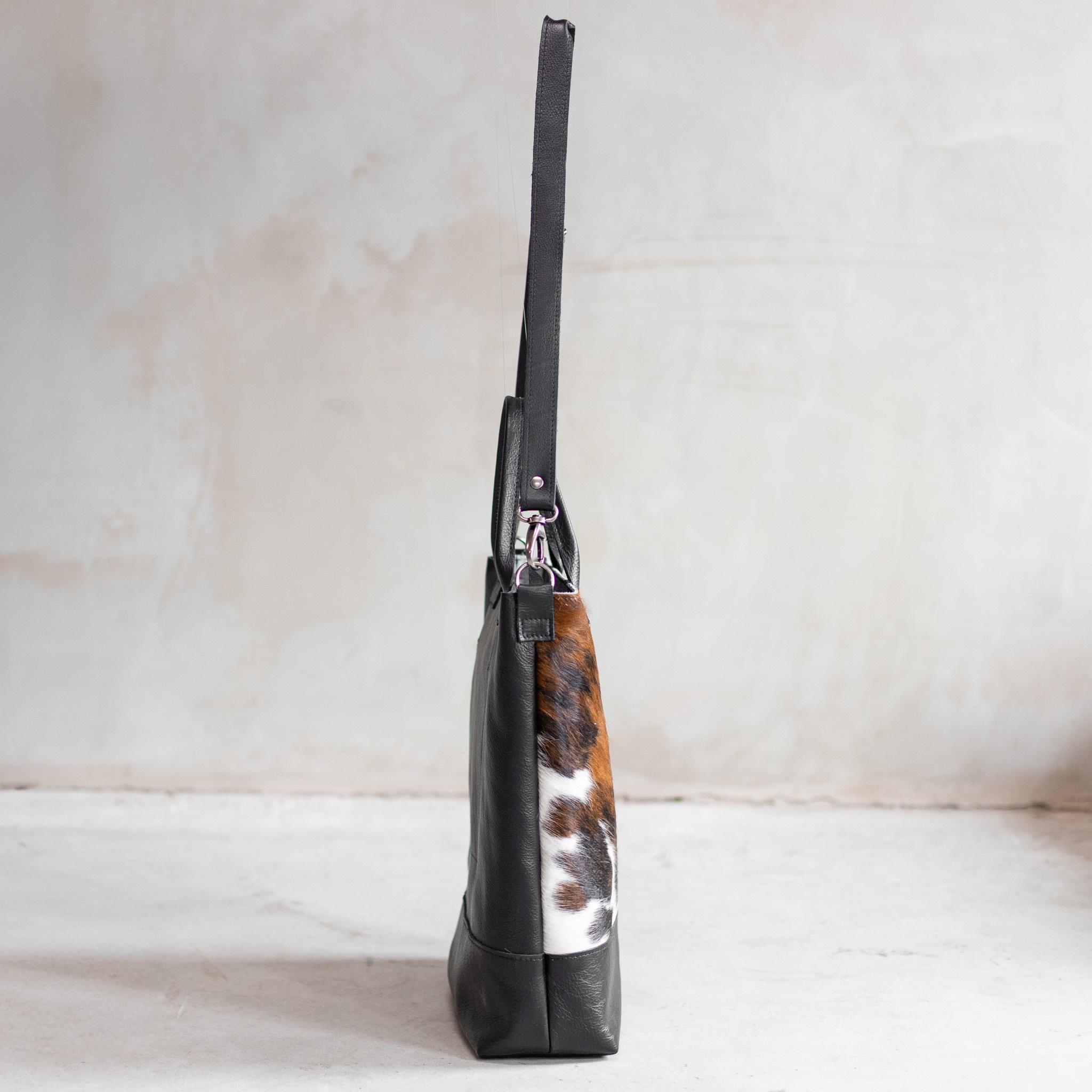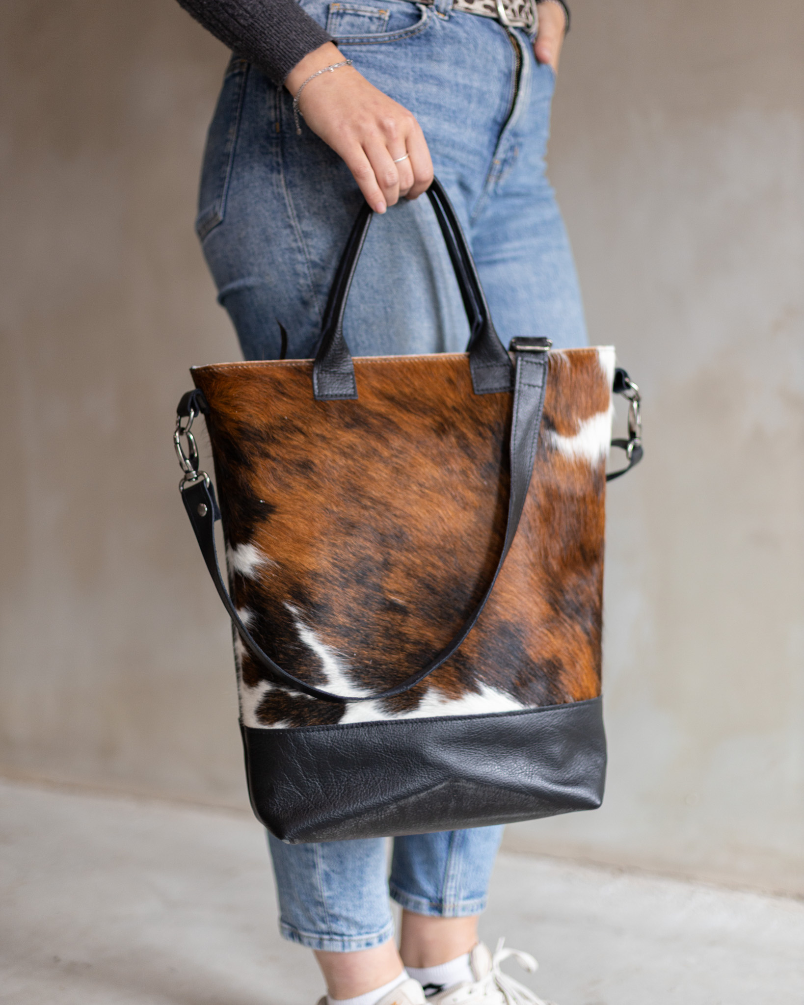 Tas Jolie is een ruime, hippe tas gemaakt van hoogwaardig nerfleder. De combinatie met geprinte koeienhuid geeft de tas een uniek uiterlijk. Ideaal om mee te nemen tijdens een dag weg, naar je werk of je studie! Door het ruime formaat van de tas, neem je er gemakkelijk al je belangrijke spullen in mee: portemonnee, telefoon, sleutels, je lunch, maar ook je laptop past er in! Perfect voor het werk & dagelijks gebruik. Door het handige steekzak in de binnenkant, heb je je pasjes, sleutels en telefoon snel bij de hand.