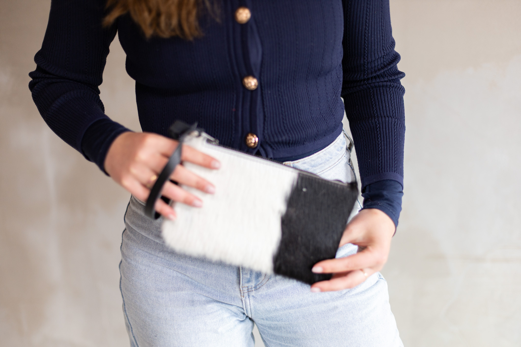 Dit mooie crossbody tasje is perfect tijdens een dagje weg! Het tasje is handgemaakt in Nederland van nerfleder & koeienhuid met print, helemaal uniek dus! In het tasje stop je jouw belangrijkste items zoals je telefoon, sleutels & pasjes.