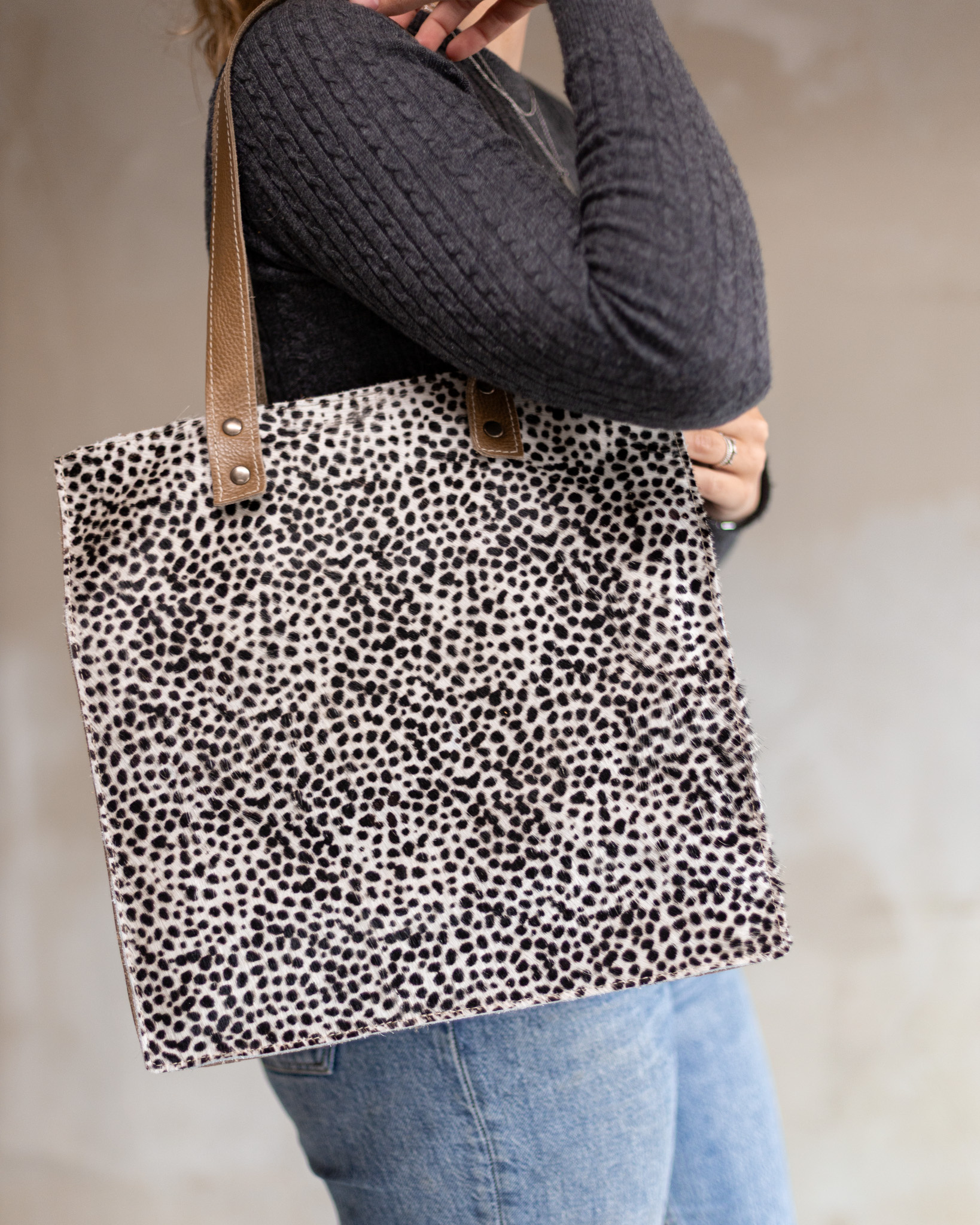 Een ruime shopper van stevig nerfleder. Ideaal om mee te nemen op een uitje, naar je werk of je studie! Draag hem als handtas of om je schouder. De tas is een combinatie van leer met geprinte koeienhuid. Door het grote formaat, neem je er gemakkelijk al je belangrijke spullen in mee: portemonnee, telefoon, sleutels, je lunch, maar ook je laptop past er in! Perfect voor het werk & dagelijks gebruik. In het afsluitbare binnenzakje bewaar je veilig je sleutels & pasjes.
