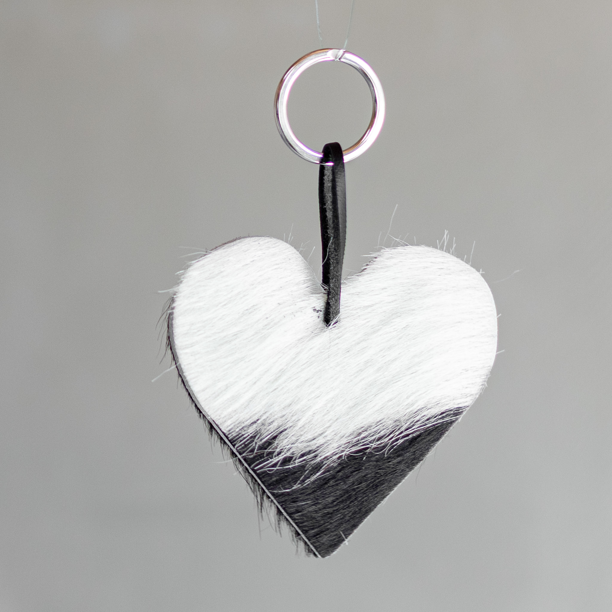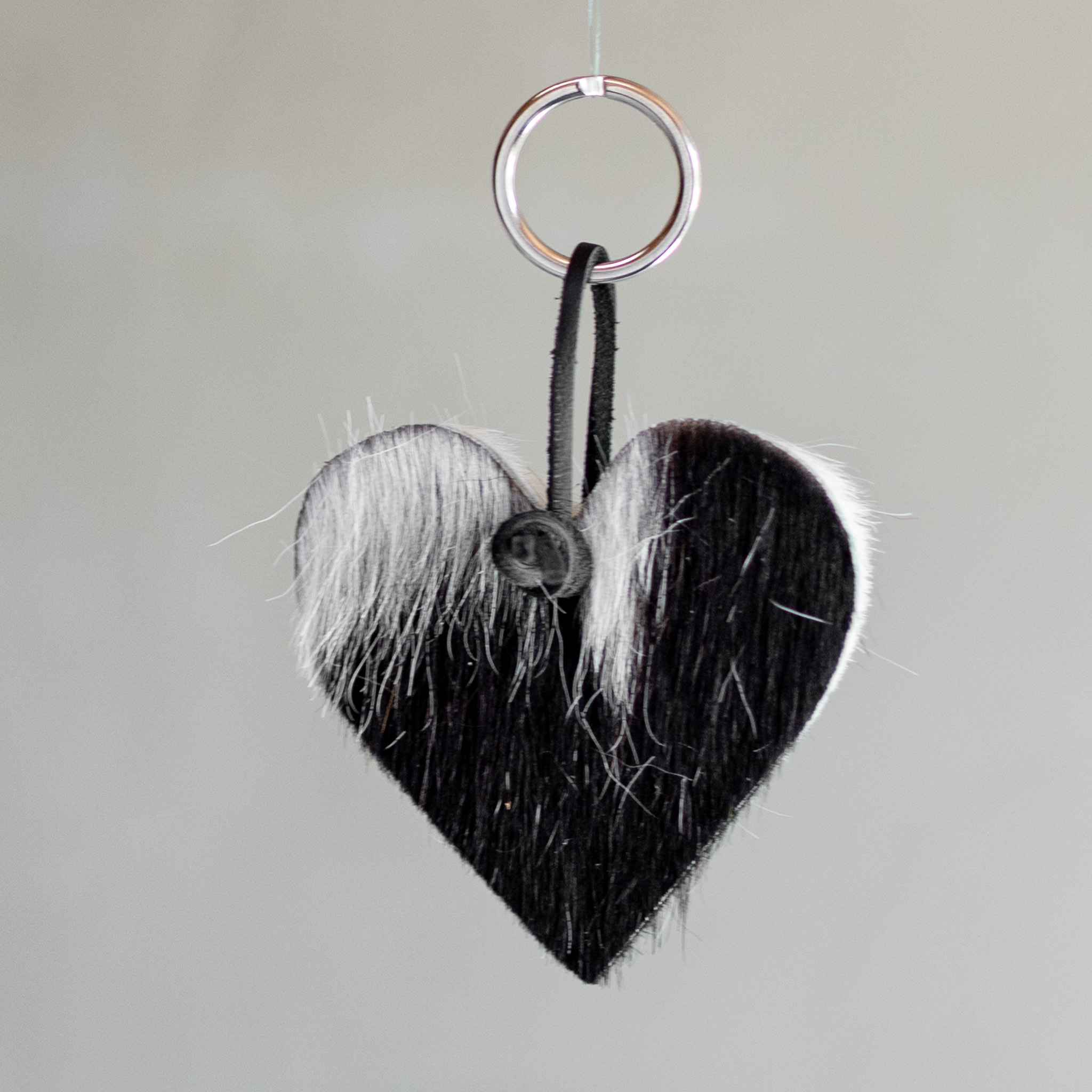 Leuke hartvormige sleutelhanger gemaakt van koeienhuid. De sleutelhanger heeft een sleutelring en een leren veter om al jouw sleutels op een stijlvolle manier bij elkaar te houden.