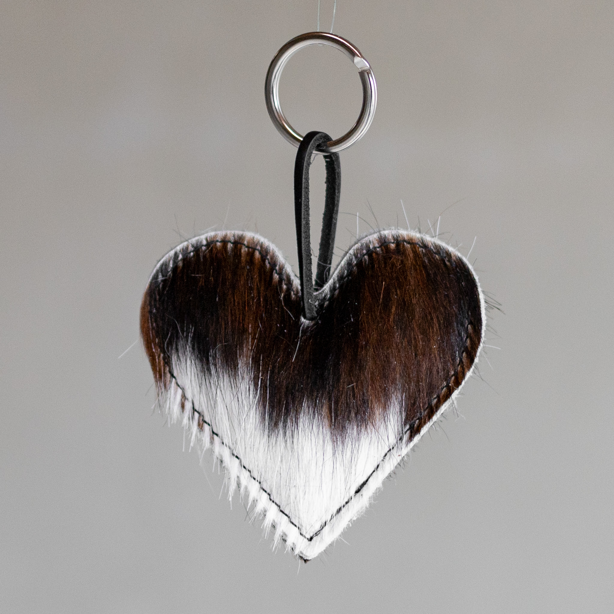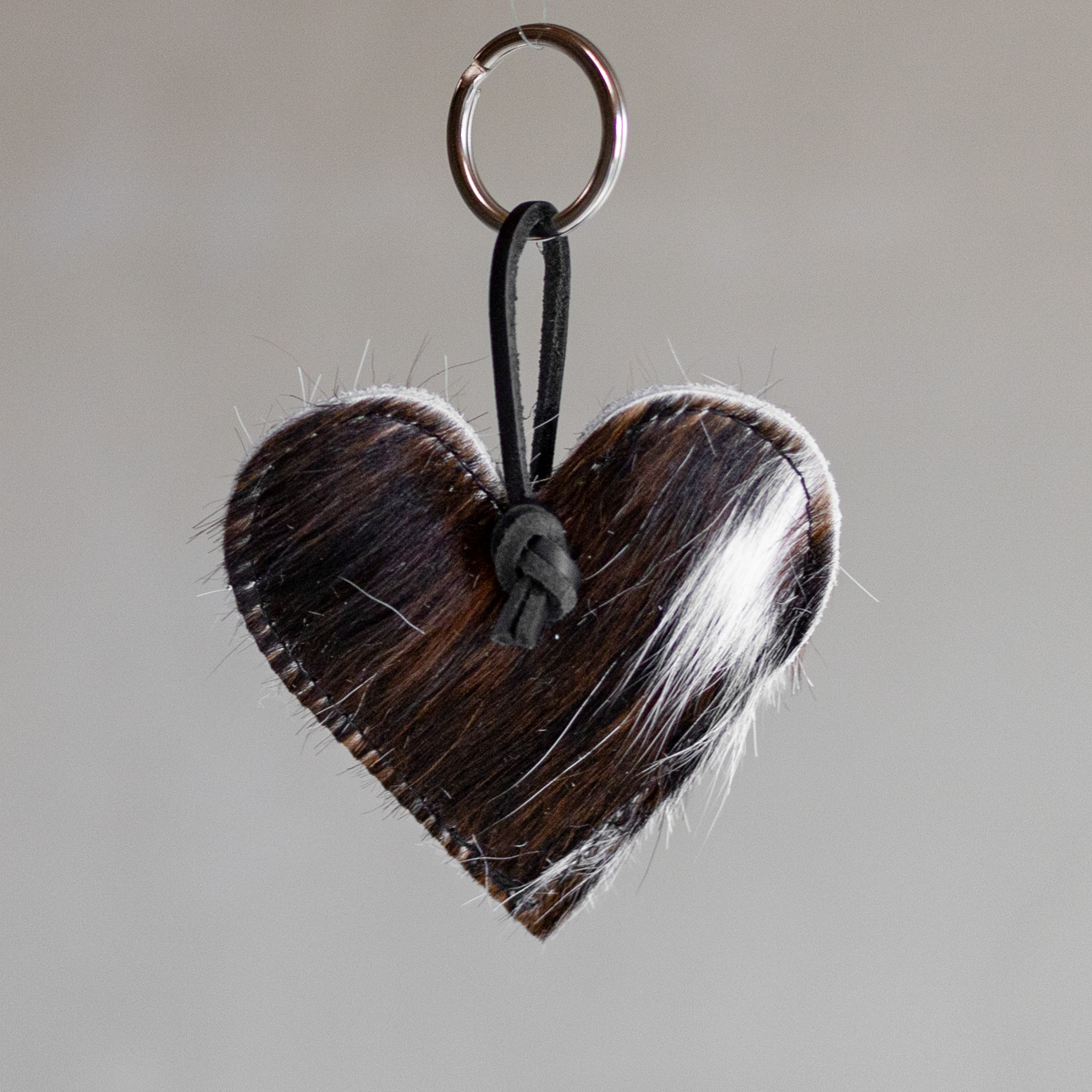 Leuke hartvormige sleutelhanger gemaakt van koeienhuid. De sleutelhanger heeft een sleutelring en een leren veter om al jouw sleutels op een stijlvolle manier bij elkaar te houden.