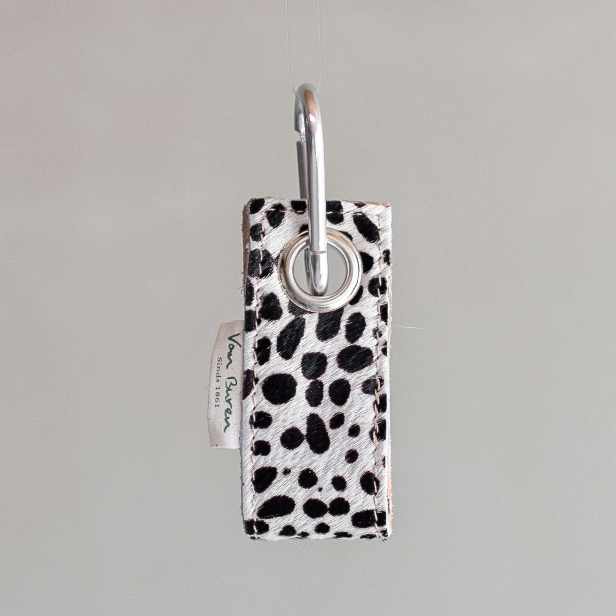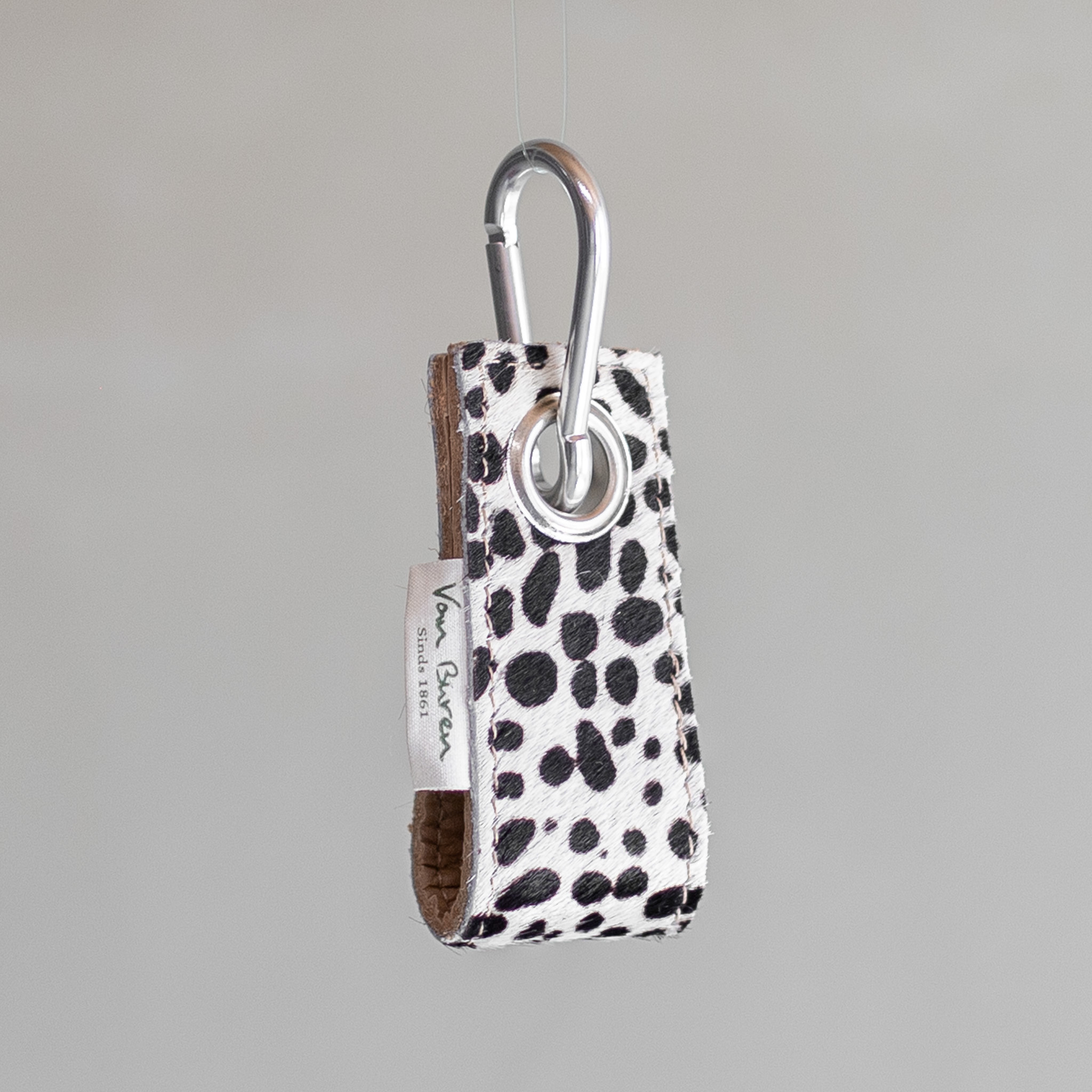 Leuke keycord sleutelhanger gemaakt van beige koeienhuid. De sleutelhanger heeft een karabijnhaak en een sleutelring om al jouw sleutels bij elkaar te houden.