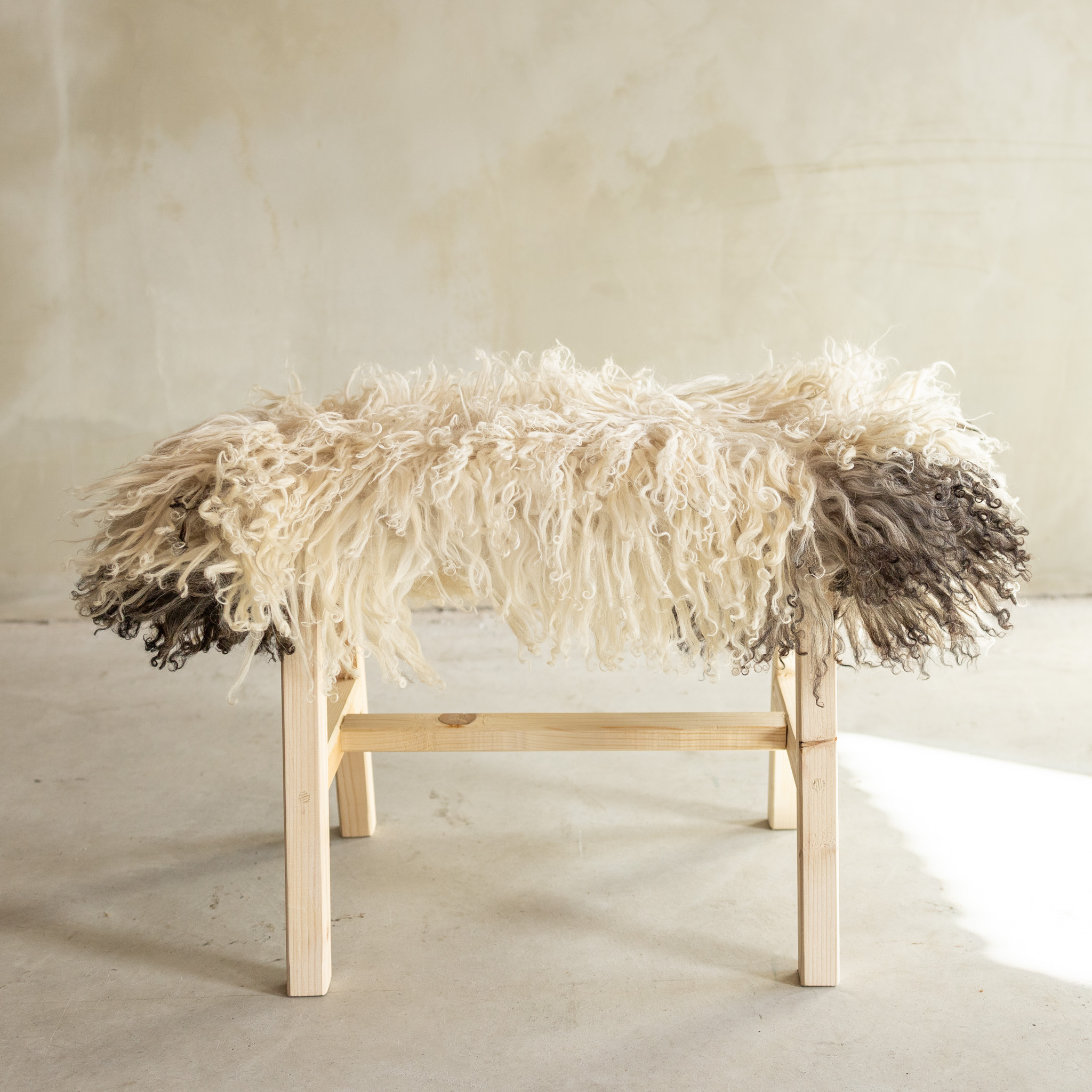 Uniek Gefotografeerd Houten Bankje met Schapenvacht - Krul/Bergschaap - 70x20x46 cm (LxBxH) - BNK-21