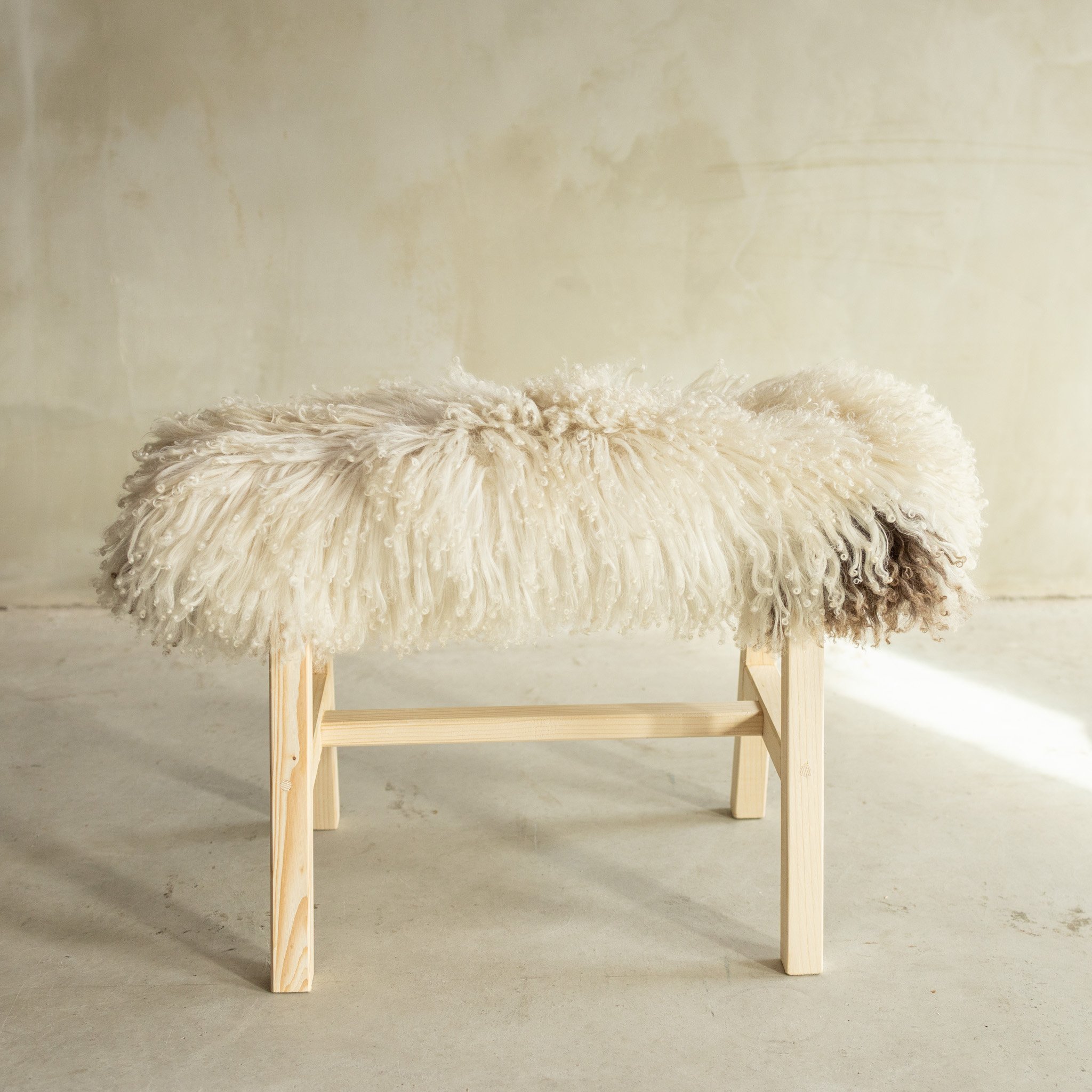 Uniek Gefotografeerd Houten Bankje met Schapenvacht - Krul/Bergschaap - 70x20x46 cm (LxBxH) - BNK-46
