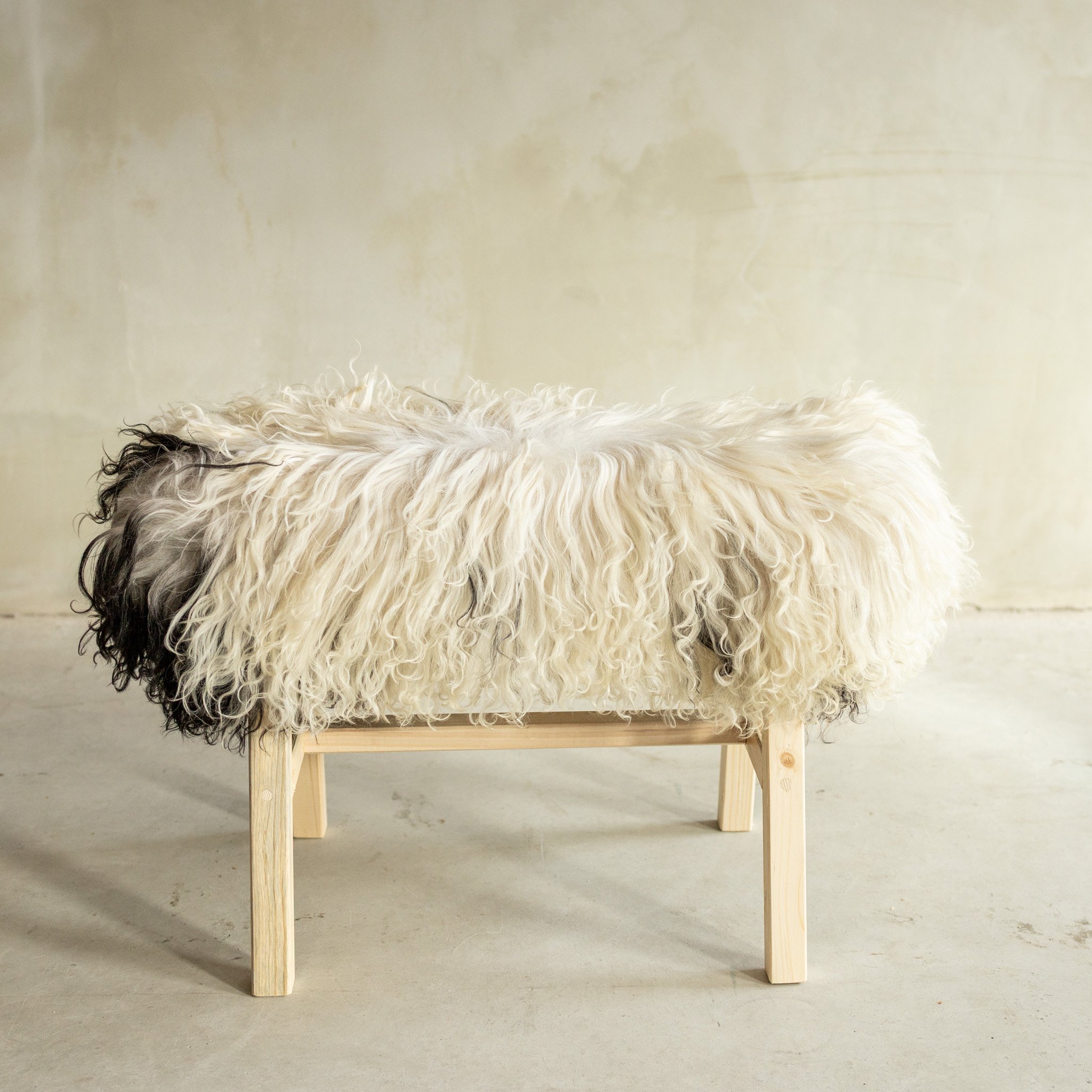 Uniek Gefotografeerd Houten Bankje met Schapenvacht - Krul/Bergschaap - 70x20x46 cm (LxBxH) - BNK-47