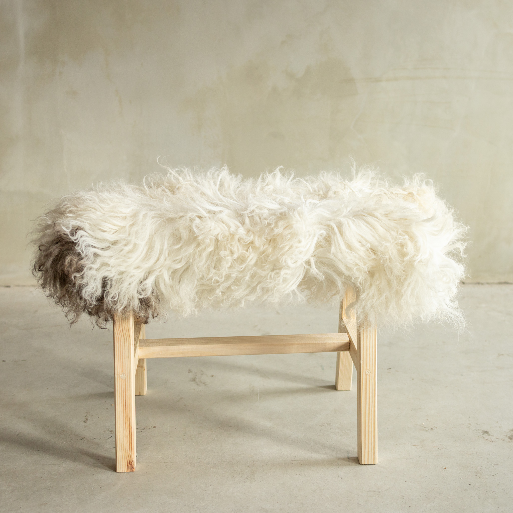 Uniek Gefotografeerd Houten Bankje met Schapenvacht - Krul/Bergschaap - 70x20x46 cm (LxBxH) - BNK-49